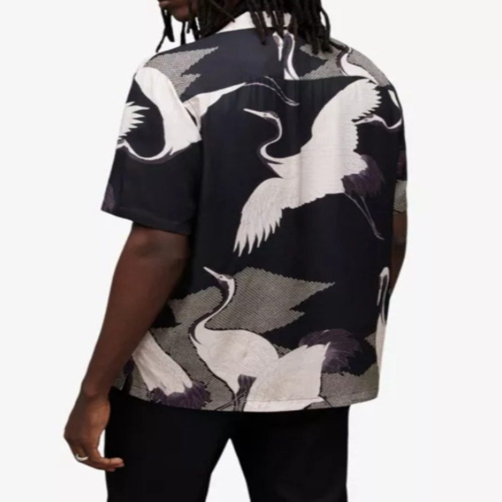Its short-sleeve cut and button-front closure make it versatile and easy to layer, while the option of a classic shirt collar or relaxed Cuban collar allows it to transition seamlessly from day to night looks. The bold yet tasteful design captures attention without being overpowering, making it ideal for both on-screen appearances and everyday wear.