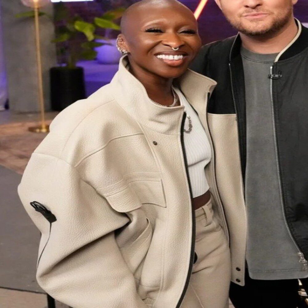 This ivory leather biker jacket strikes a balance between bold and refined. The stand-up collar and zip detail add modern structure, while the creamy tone softens the edge—making it equally suited for red carpet flair or elevated everyday wear. Cynthia Erivo’s choice underscores her flair for “edgy meets elegance,” creating a versatile piece that commands attention with understated sophistication.
