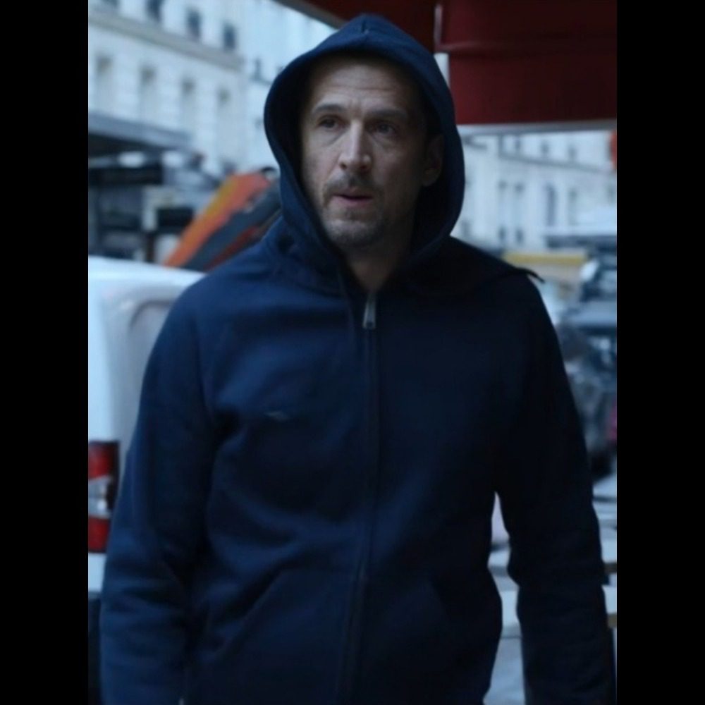 The hooded jacket fuses utility with modern styling—lightweight, functional, and visually discreet. Its fleece build allows for dynamic movement, while the hood and pockets add a tactical edge befitting the character’s background.