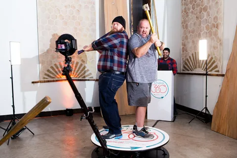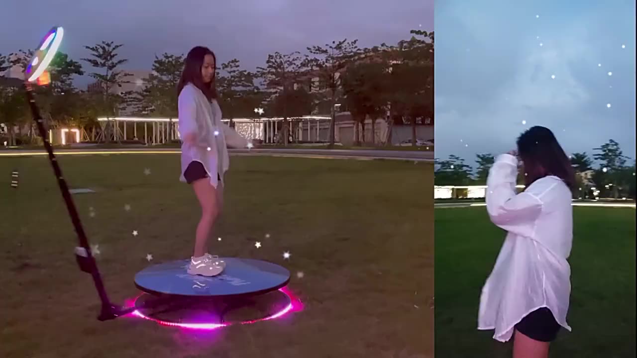 Rotating the CAMERA arm to capture Video footage of a person standing on the platform. “360 Video booth” as it primarily produces Video content rather than still Photos.